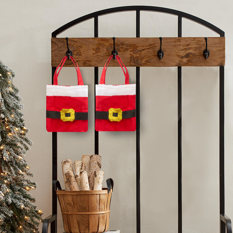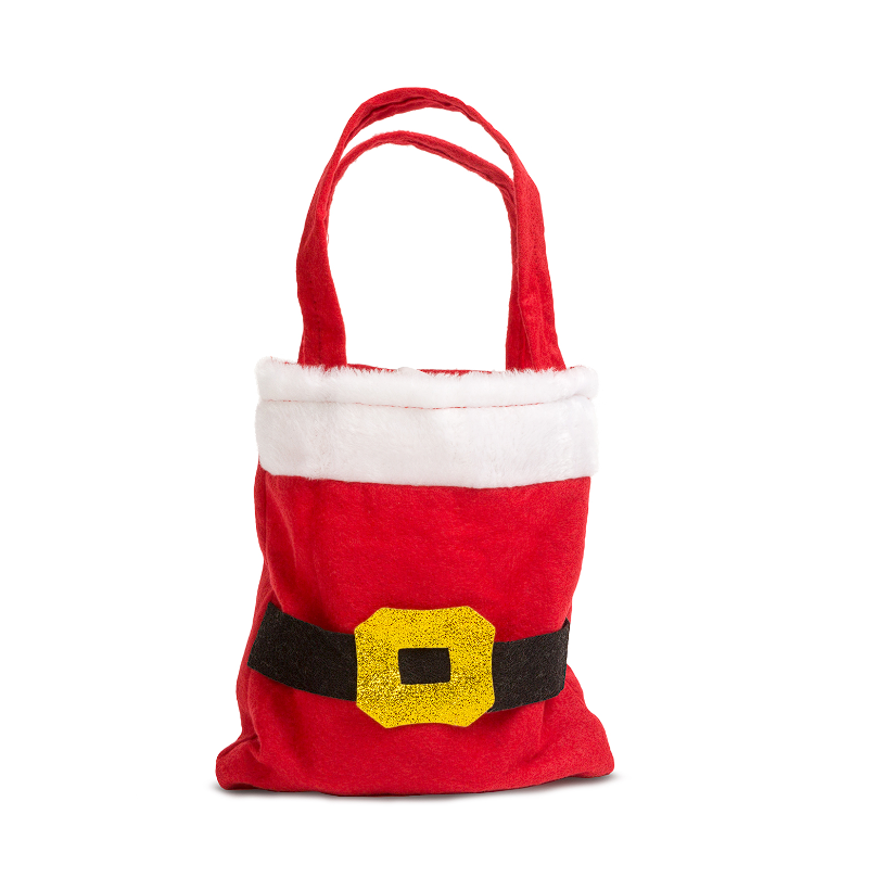 Oferă cadouri cu stil! Geantă cadou din material moale, cu centură de Moș Crăciun. Ideal pentru a oferi mici cadouri.