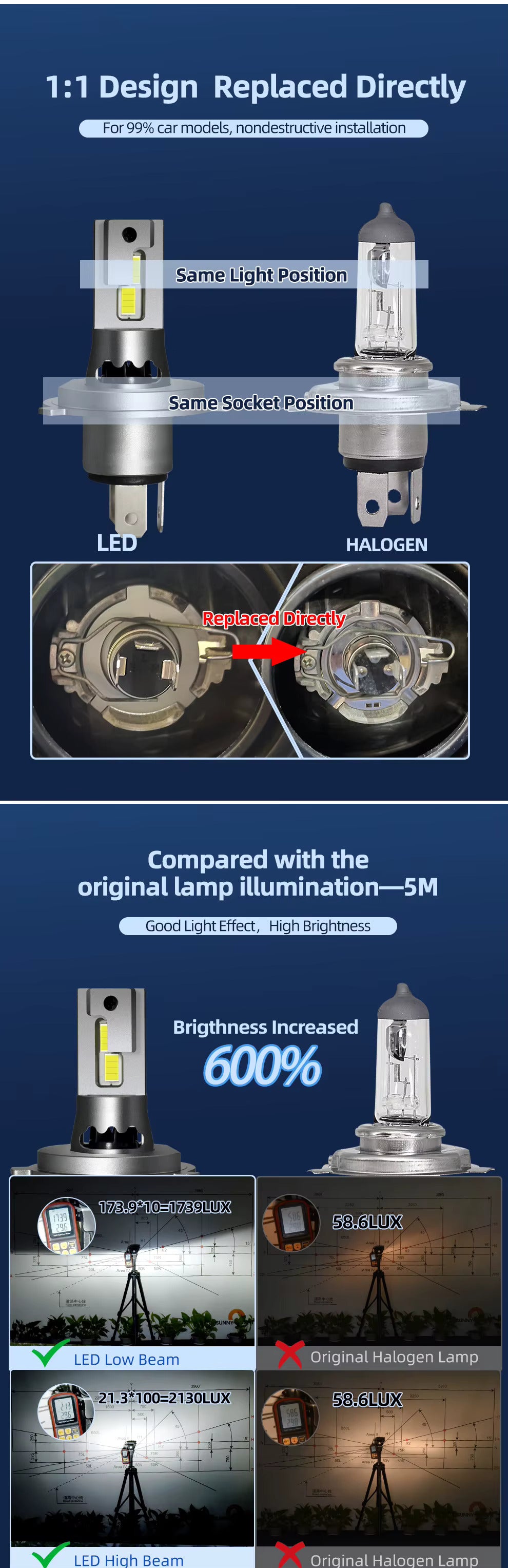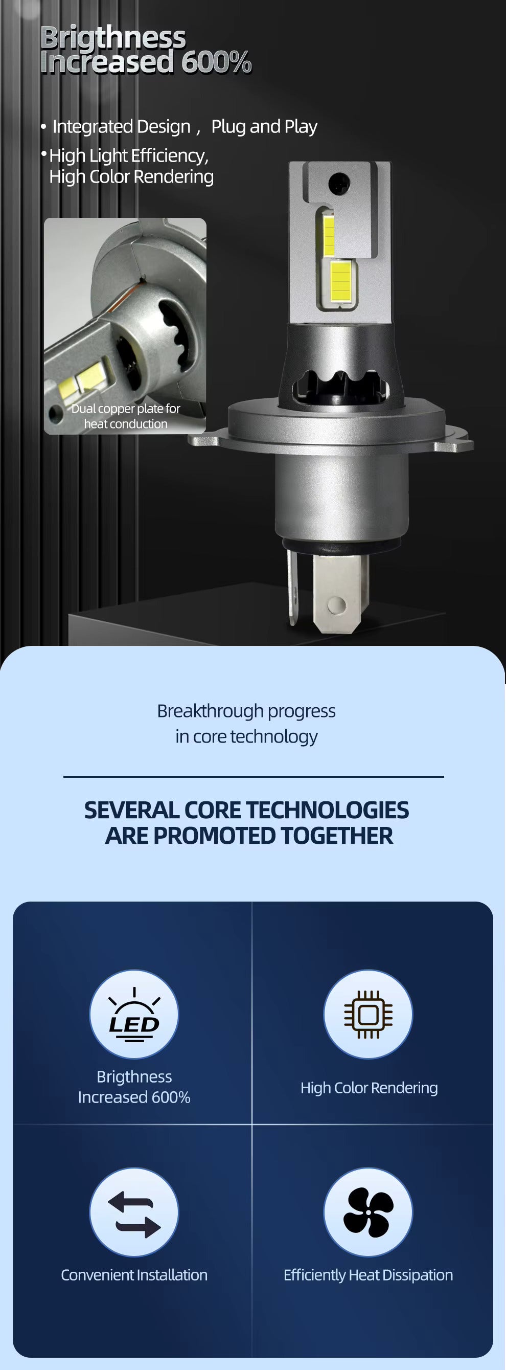 - Datorita noii constructii inovatoare, ventilatorul este plasat in partea de sus a retrofitului, pastrand dimensiuni similare cu becul clasic H4